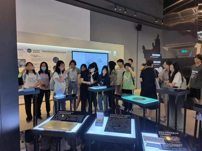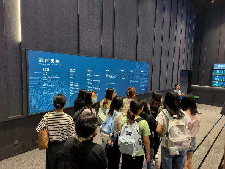 跟随着展厅讲解员的脚步,同学们走进成都芯谷产业园总展厅,映入眼帘的是充满科技感的电子信息设备,同学们认真了解了芯片产业的发展现状。