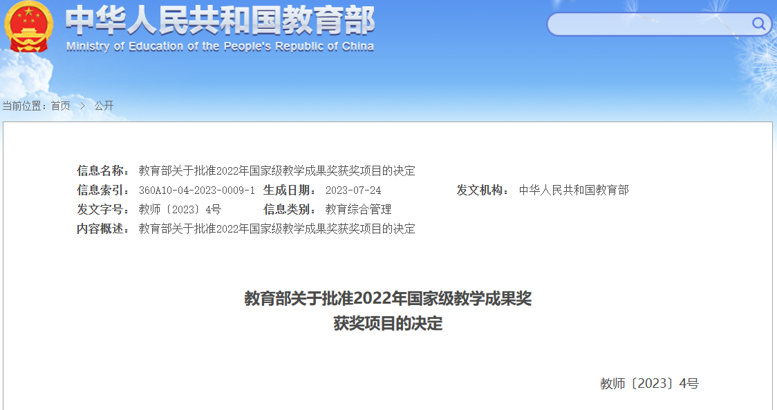 2023年7月21日,《教育部关于批准2022年国家级教学成果奖获奖项目的决定》(教师〔2023〕4号)正式发布。在本次国家级教学成果评选中,beat365官网荣获国家级教学成果奖二等奖1项,参与一等奖和二等奖各1项目,取得了重大成绩。