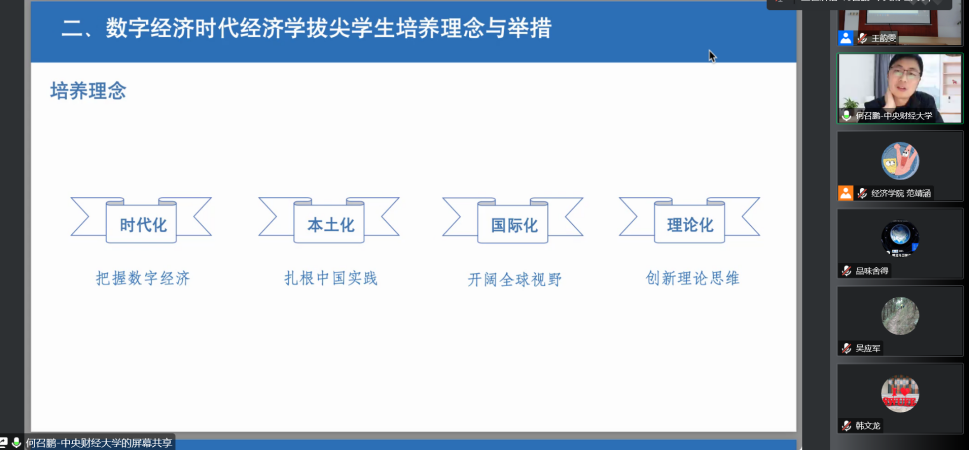 最后,何召鹏教授结合培养方案介绍了中央财经大学经济学拔尖人才培养的课程体系建设,并就如何提高学生专业知识水平及学术能力发表见解。何教授指出:数字经济拔尖人才的培养是面向世界的,其培养模式和课程体系建设依然需要探索完善。