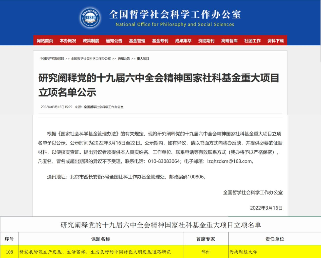 2022年4月8日,全国哲学社会科学工作办公室公布了研究阐释党的十九届六中全会精神国家社科基金重大项目立项名单,全国130个课题获立项,beat365官网邹红教授为首席专家的《新发展阶段生产发展、生活富裕、生态良好的中国特色文明发展道路研究》成功中标立项。此课题围绕“新发展阶段中国特色文明发展道路是什么,如何坚持并走好这条道路?”两大具体问题,以“生产生活生态(简称三生)”全面绿色转型和“三生”绿色统筹协同为抓手,探寻新发展阶段绿色低碳可持续的生产发展道路、绿色共享的生活富裕发展道路、人与自然和谐共生的生态良好发展道路、“三生”绿色协同发展道路的内在机制与实现路径,力求为人类文明新形态提供新发展阶段的中国方案。这是邹红教授继2018年主持申报研究阐释党的十九大精神国家社科基金重大专项项目《完善促进人民美好生活消费需要的体制机制创新研究》获批立项之后再次获得的国家社科基金重大项目立项。
