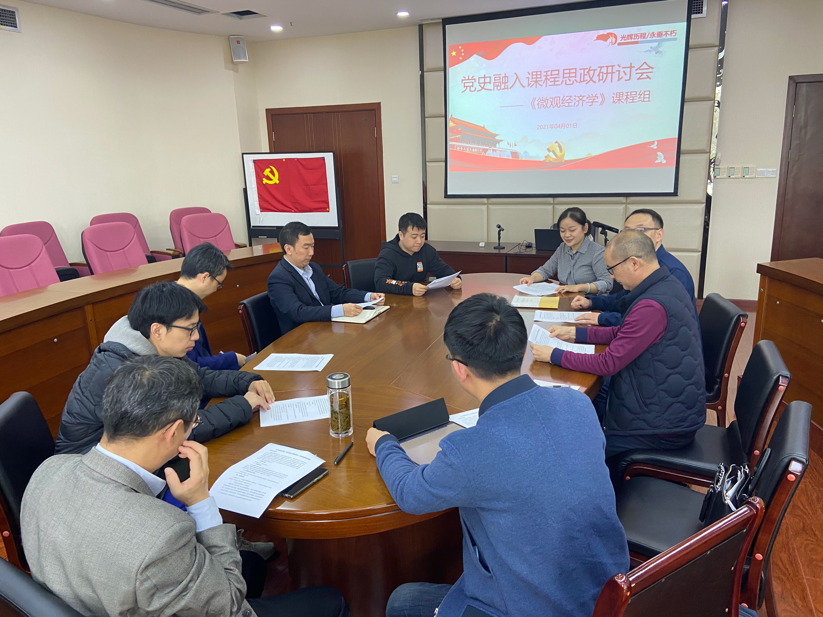2021年4月1日《微观经济学》课程组在格致楼918会议室召开了主题为“党史融入课程思政”的研讨会。课程组组长程瑶主持会议,学校教务处史丽婷老师参会指导。