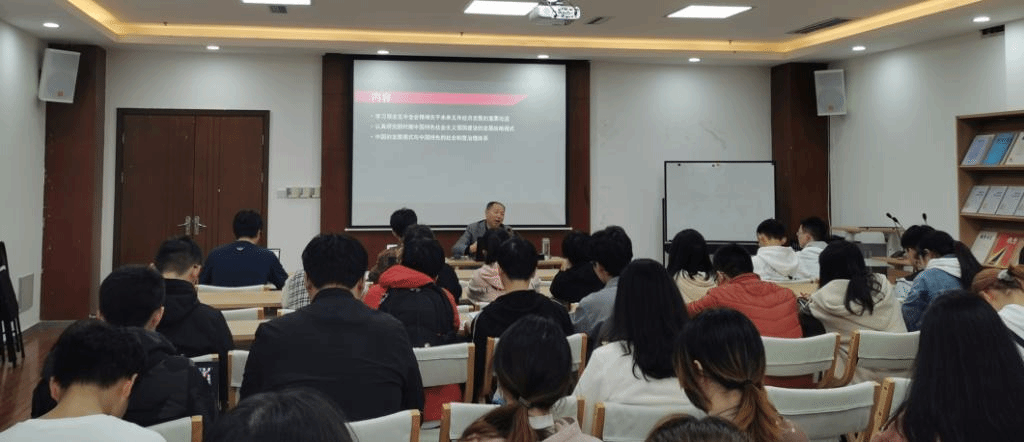 易敏利结合发展经济学的学术视角,从学习领会十九届五中全会精神关于未来五年经济发展的重要论述、认真研究新时期中国特色社会主义强国建设的发展战略模式、中国的发展模式与中国特色的社会制度治理体系等三个方面展开讲授,通过丰富的案例、深入浅出的语言,以“十四五”规划和2035年经济发展目标切入,阐释了新中国经济快速发展和社会长期稳定“两大奇迹”与中国特色社会主义制度国家治理体系的内在联系,带领同学们一同展望了在中国共产党的坚强领导下中国特色社会主义现代化强国建设的新征程。