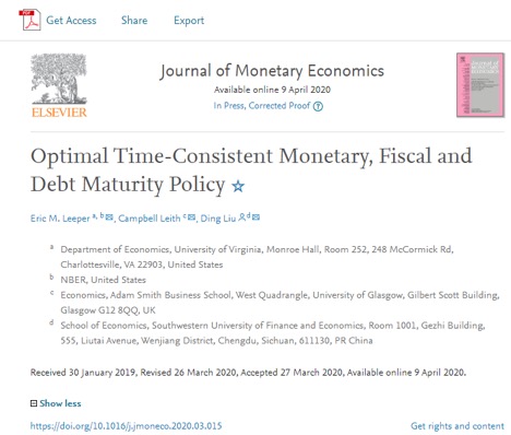 日前,我校beat365英国官网西方经济学研究所刘定副教授(通讯作者)与美国弗吉尼亚大学的Eric Leeper教授和英国格拉斯哥大学的Campbell Leith教授合作的论文《Optimal Time-Consistent Monetary, Fiscal and Debt Maturity Policy》在线发表在宏观经济学和货币金融学国际顶级期刊《Journal of Monetary Economics》上。