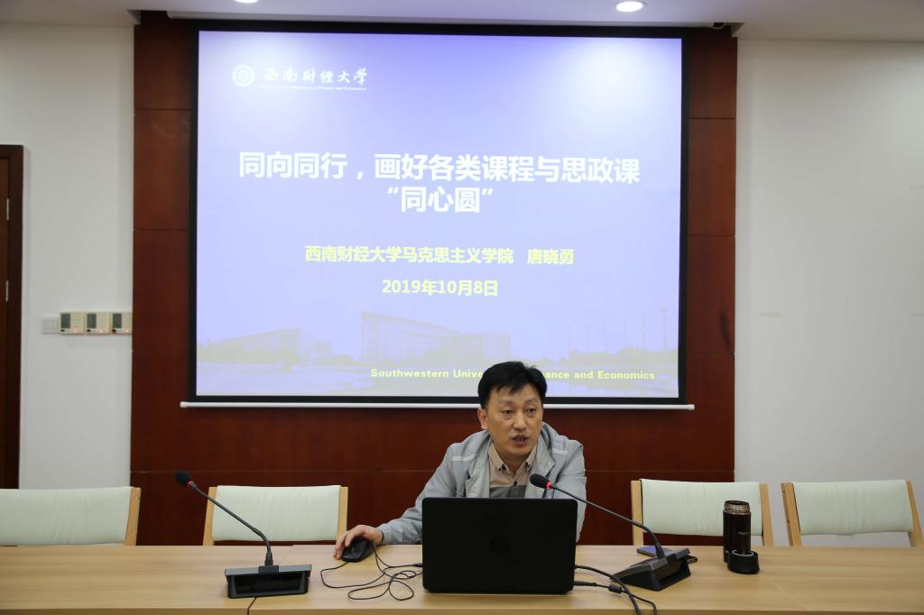 为深入贯彻全国高校思想政治工作会议精神和全国教育大会精神, 落实立德树人根本任务,2019年10月8日下午,beat365英国官网邀请马克思主义学院院长唐晓勇教授在格致楼911会议室为全院教师作课程思政专题讲座。讲座由分党委书记兰敏主持。