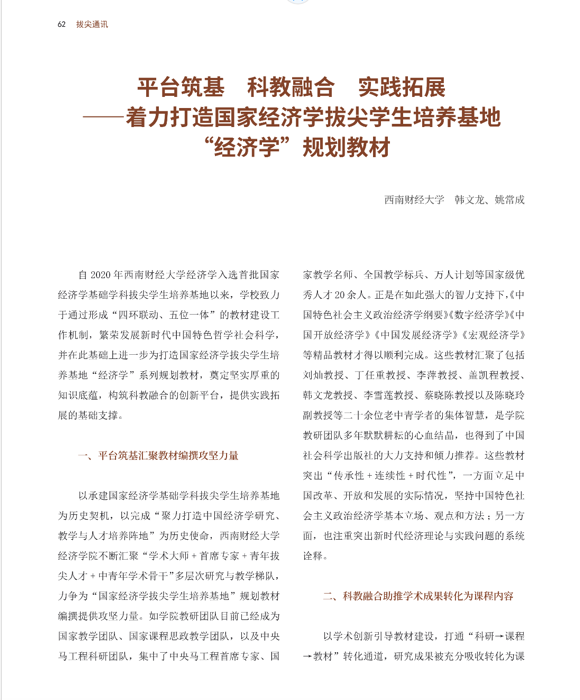 beat365英国官网韩文龙教授和姚常成副教授撰写的《平台筑基 科教融合 实践拓展——着力打造国家经济学拔尖学生培养基地“经济学”规划教材》在教育部拔尖计划2.0内刊《拔尖通讯》2023年第10期“研究成果”栏目刊发, 文章主要从(1)平台筑基汇聚教材编撰攻坚力量;(2)科教融合助推学术成果转化为课程内容;(3)实践拓展提炼“中国理论”,讲好“中国故事”三个方面介绍了经济学拔尖学生培养基地围绕“精品教材”建设所取得的优秀成果。