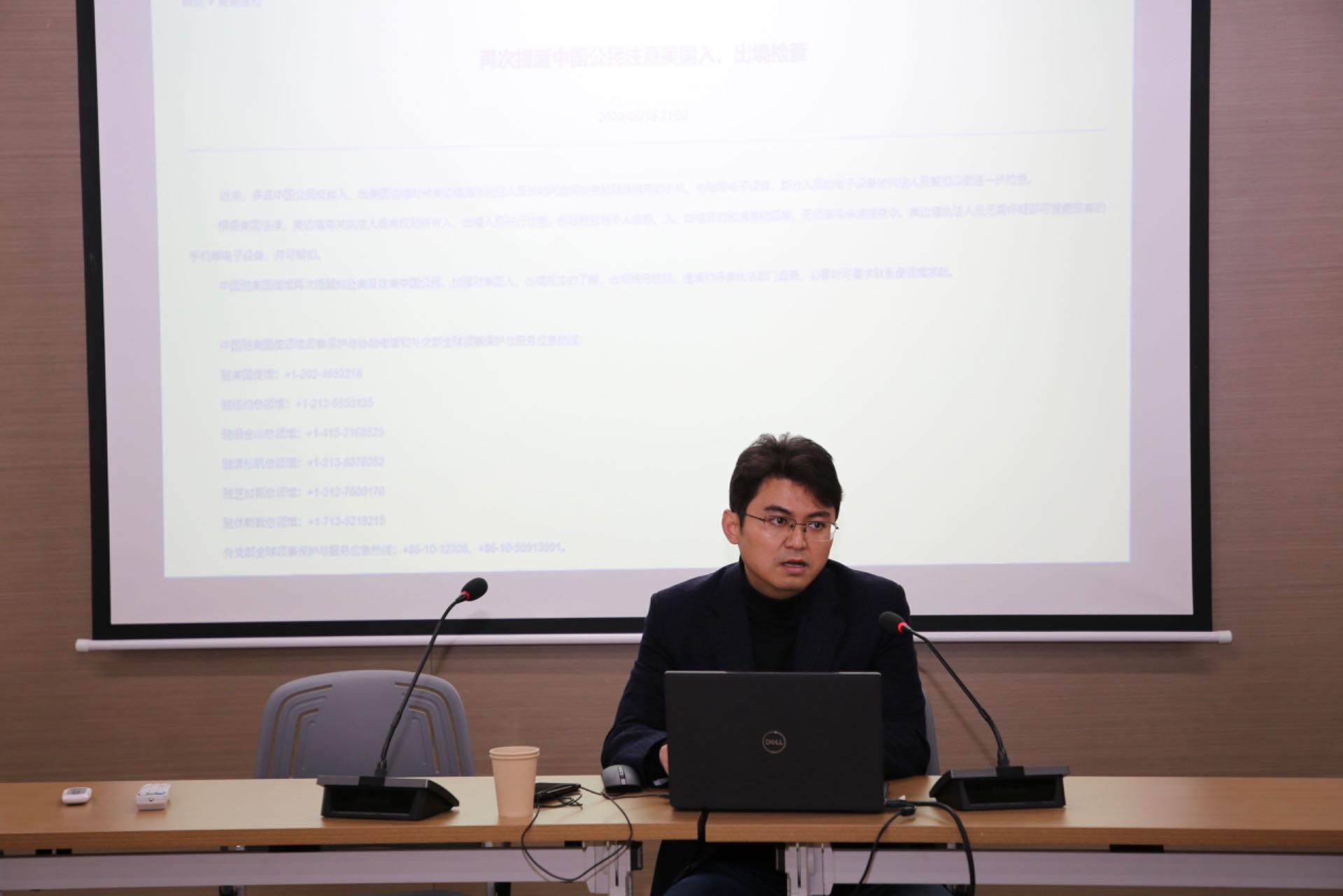然后,蒋建华结合自身的工作经历,列举出国交流中师生可能会面临的主要风险,例如出入境盘查、电信诈骗、学术诚信等等。他强调,在外学习生活,师生一定要提前做好准备,遇到问题,要冷静应对,望大家切实把安全和健康放在首位,遵守当地法律法规,提高自我保护意识和防范各类风险能力。最后,他指出,要提高警惕谨防电信诈骗,接到可疑电话,可挂断后拨打中国驻当地使领馆官方网站提供的联系电话,或拨打外交部全球领事保护与服务应急呼叫中心12308热线寻求帮助。