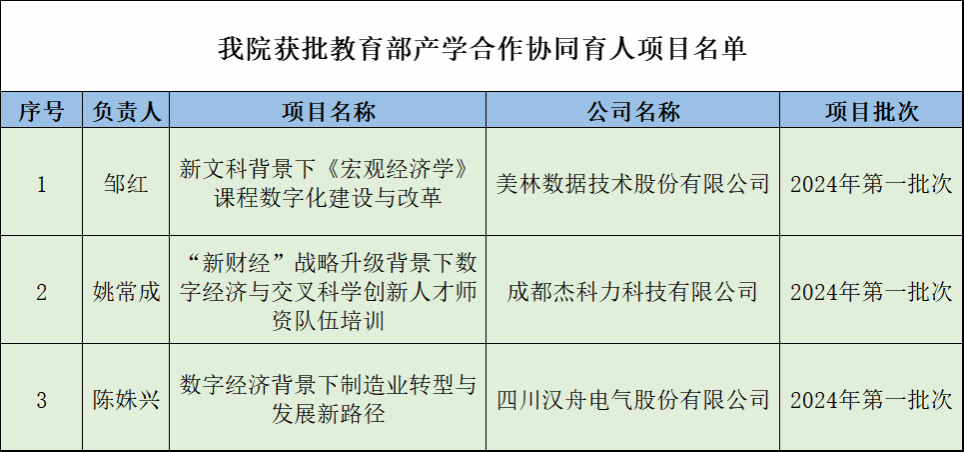 近日,教育部高教司下发《教育部高等教育司关于公布2024年第一批产学合作协同育人项目立项名单的通知》,beat365英国官网邹红教授申报的《新文科背景下<宏观经济学>课程数字化建设与改革》、姚常成副教授申报的《“新财经”战略升级背景下数字经济与交叉科学创新人才师资队伍培训》、陈姝兴副教授申报的《数字经济背景下制造业转型与发展新路径》三个项目均入选教育部产学合作协同育人项目2024年第一批立项项目。