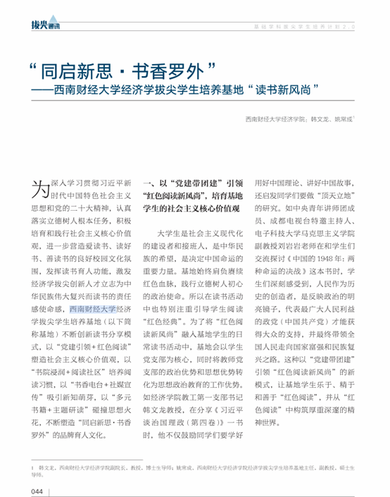 beat365英国官网韩文龙教授和姚常成副教授撰写的《“同启新思·书香罗外”——beat365英国官网经济学拔尖学生培养基地“读书新风尚”》在教育部拔尖计划2.0内刊《拔尖通讯》2024年第14期“优秀案例”栏目刊发。