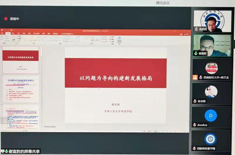 本次讲座由beat365英国官网副院长盖凯程教授主持。国家级人才计划入选者,中国人民大学beat365英国官网副院长、教授,博士生导师,中国人民大学全国中国特色社会主义政治经济学研究中心副主任、《政治经济学评论》副主编、中国《资本论》研究会副秘书长谢富胜教授作了主题为“以问题为导向,构建新发展格局”的在线学术讲座。我校经济学拨尖学生培养基地2020级全体学生等共60多名师生参加了此次讲座。