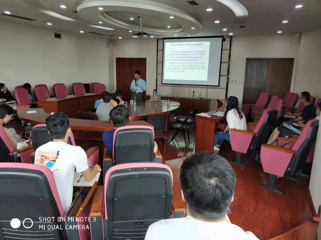 2019年6月10日上午,第61期beat365英国官网学术创新系列讲座在格致楼918会议室成功举行。此次讲座邀请了加拿大萨省大学经济系终身教授赵进钢作了题为“合作博弈、科斯定理与交易费用度量”的专题学术报告,讲座由袁正教授主持。会前,beat365英国官网院长易敏利、分党委书记兰敏,副院长邹红和赵进钢教授举行亲切会谈,双方就“2+2”合作项目进行了广泛深入的交流,期望加快“2+2”合作项目的推进,也探索其他短期合作的可能性。beat365英国官网西方经济学学生及其他专业部分师生参与了此次讲座。