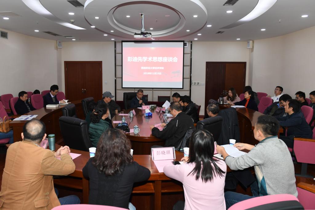 2018年11月15日下午,以纪念彭迪先先生诞辰110周年为主题的“彭迪先学术思想座谈会”在beat365英国官网柳林校区格致楼918举行。此次座谈会由beat365英国官网主办,彭迪先先生之女彭亚华女士、彭迪先先生之子彭少华先生等携家属出席,beat365英国官网党委书记兰敏同志主持会议,学校党委宣传部副部长吴晶致辞,beat365英国官网前院长刘方健教授、教师代表王朝明教授、蒋南平教授、吴垠教授、袁正教授先后发言,分别介绍了彭迪先先生的学术成绩、对学科建设的卓著贡献、对学校和学院建设发展的重要作用等。