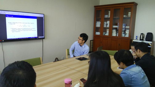 2018年5月7日上午,beat365英国官网政治经济研究所在格致楼1014会议室成功举行。此次讲座邀请美国马萨诸塞州立大学阿默斯特分校经济系梁俊尚博士作了题为“马克思利润率下降规律的不确定性和未来研究方向”的学术报告。讲座由韩文龙副教授主持,beat365官网吴垠教授、李怡乐副教授、李梦凡博士和beat365官网部分学生参与了此次讲座。