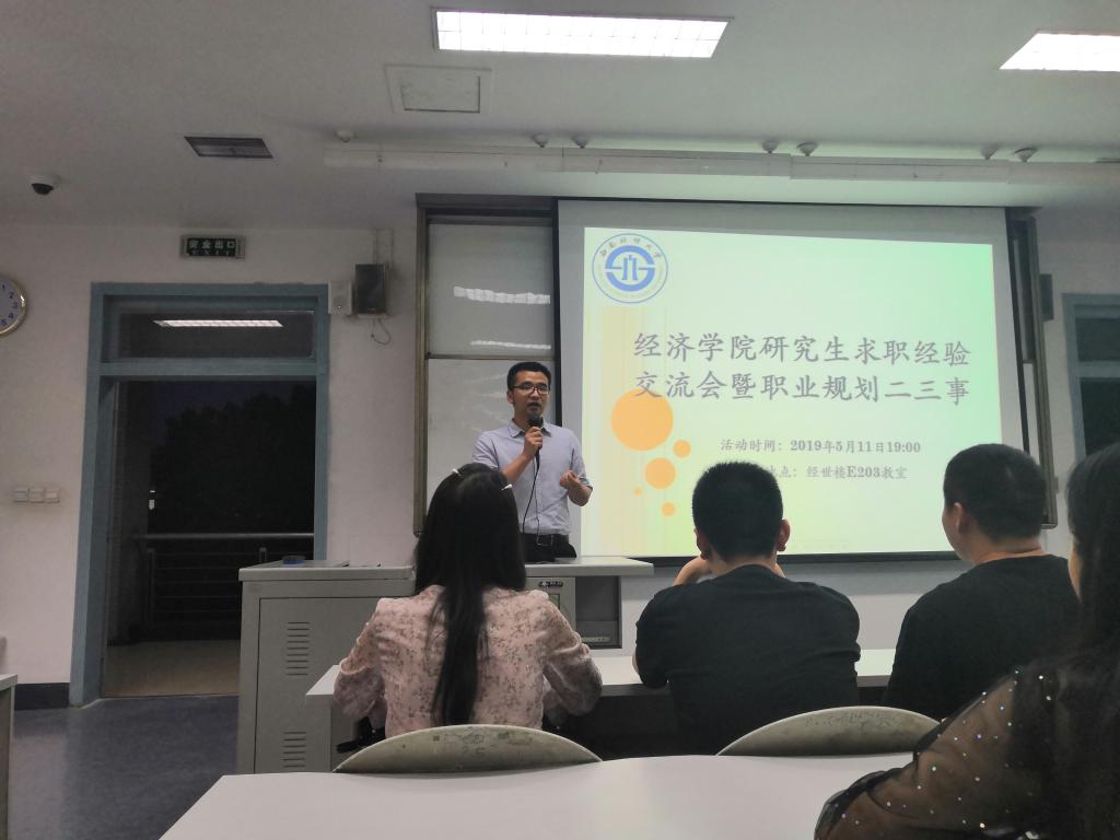 为加强研究生毕业班同学与低年级之间的交流,解答低年级同学的求职困惑,更好地帮助同学们做好职业规划,2019年5月11日晚,beat365英国官网在经世楼E203教室举办主题为“beat365英国官网研究生求职经验交流暨职业规划二三事”的分享会,学院邀请beat365英国官网2016级优秀的研究生师兄师姐到会做交流,活动由学院研究生会创新创业与职业发展部承办。
